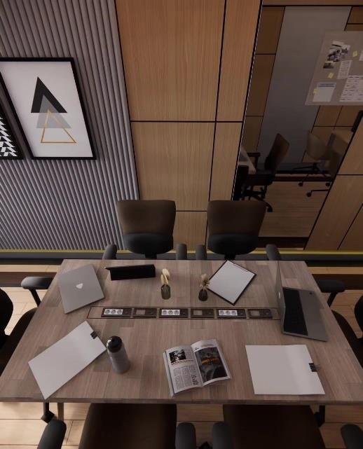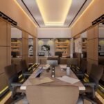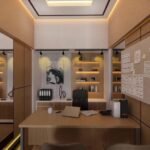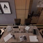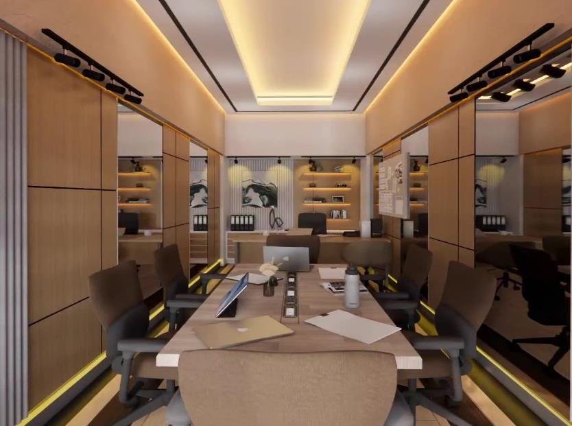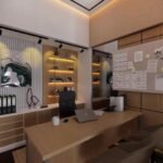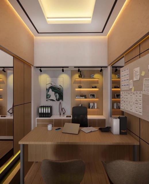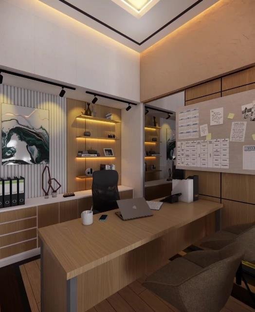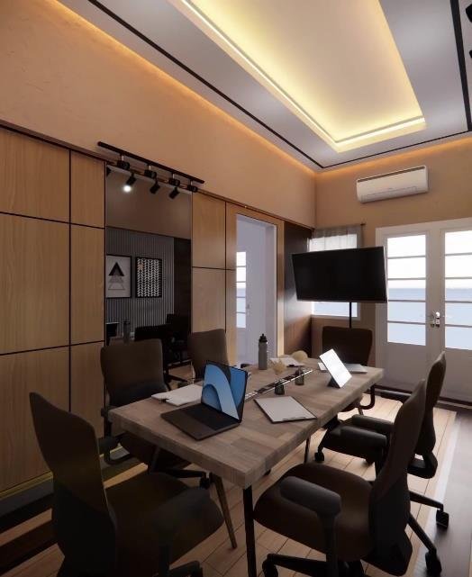 Ruang Kerja ini dirancang dengan desain modern minimalist sebagai meeting room sekaligus working space. Ruang ini menampilkan dominasi material kayu hangat, dengan perpaduan pencahayaan ambient di plafon dan indirect lighting di bagian bawah dinding, menciptakan atmosfer yang tenang namun tetap produktif. Penempatan meja panjang di tengah ruang memungkinkan interaksi tim yang intens namun tetap terorganisir, lengkap dengan kursi ergonomis yang menunjang kenyamanan kerja dalam waktu lama. Kedua sisi dinding dilengkapi panel kaca reflektif yang tidak hanya memperluas kesan ruang, tetapi juga memperkuat suasana modern dan profesional. Di ujung ruangan, area kerja tambahan dengan backdrop rak dan artwork berkarakter menambah kesan artistik sekaligus fungsional.