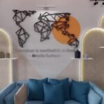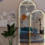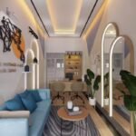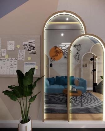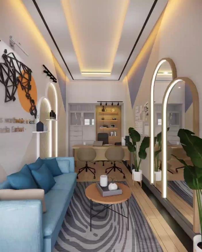 Ruang Kerja ini dirancang dengan desain modern contemporary sebagai ruang kerja sekaligus ruang tamu kantor. Ruang ini menggabungkan elemen desain kontemporer dengan pencahayaan yang lembut dan material yang nyaman dipandang maupun digunakan. Interior ruang ini memanfaatkan layout memanjang yang dibagi secara natural antara area santai dan area kerja. Di sisi depan, sebuah sofa berwarna biru lembut dengan aksen bantal senada membentuk zona penyambutan yang cozy. Coffee table minimalis dan karpet motif natural memperkuat suasana santai, sekaligus memberi kesan modern yang ringan. Cermin lengkung dengan pencahayaan tersembunyi di sisi kanan menambah dimensi ruang dan memperkuat pencahayaan alami serta buatan. Area kerja di bagian belakang didesain ringkas namun stylish, dengan rak ambalan dan backdrop kayu natural yang menambah kesan hangat. Kursi kerja berwarna netral dan pencahayaan spotlight di atas rak menciptakan suasana fokus namun tetap homey.